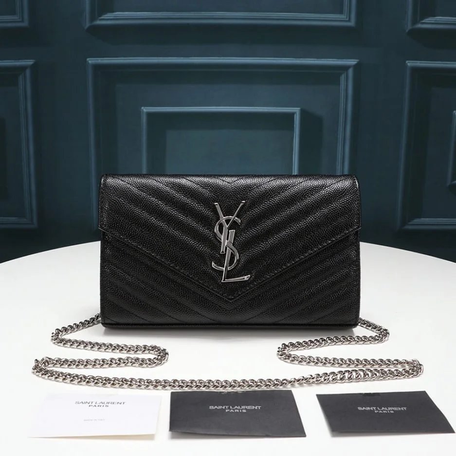 Saint Laurent Chain-strap YSL-plaque grained-leather wallet