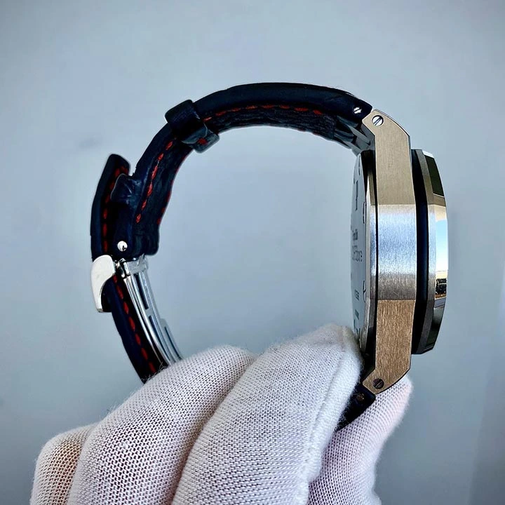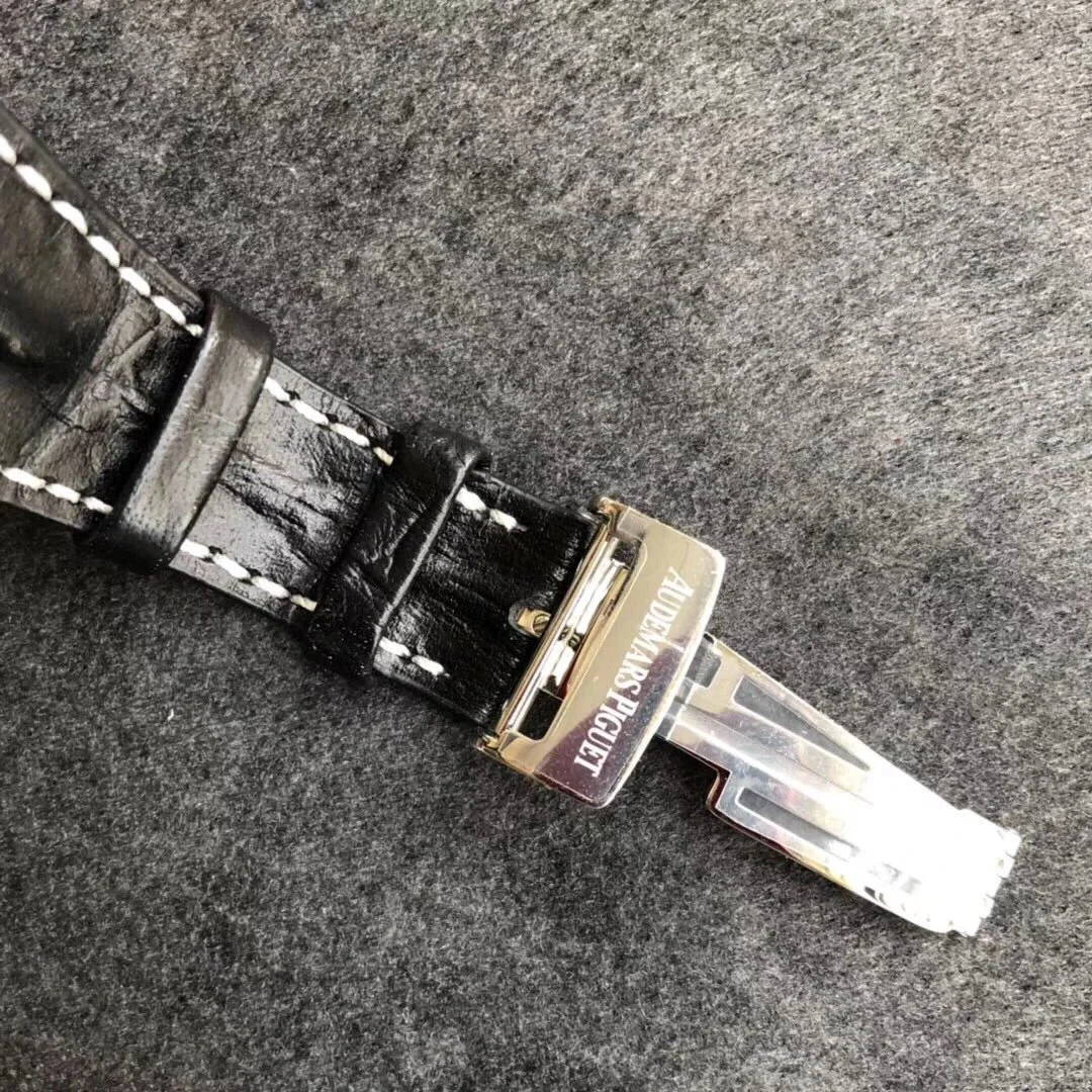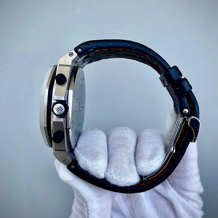 Audemars Piguet Royal Oak Offshore 26170ST.OO.D101CR.02 Mens Watch. 42mm stainless steel case. Stainless steel octagon shaped bezel. Silver Mega Tapisserie dial with steel hands and Arabic numeral hour markers. The date is displayed at 3 o’clock. Three black sub-dials. Small seconds hand at 12 o’clock. 30-minute counter at 9 o’clock. 12-hour counter at 6 o’clock. Black leather strap with stainless steel deployment buckle. Will fit up to a 7-inch wrist. Sapphire crystal. Stainless steel case back. Automatic self-winding movement. This watch comes with original Papers.
