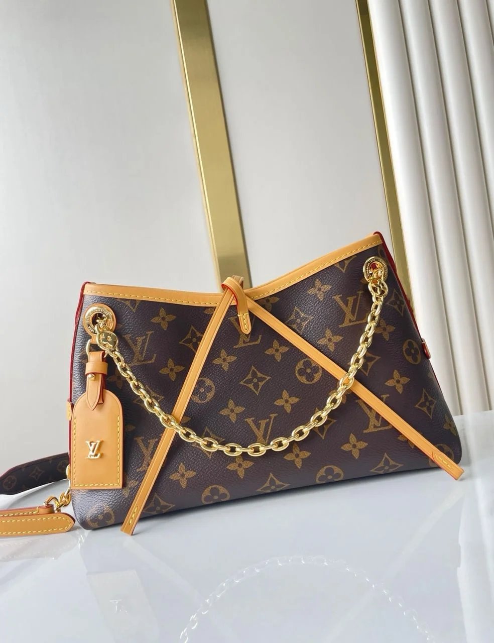 The iconic CarryAll BB is refreshed for the season in this chic day-to-evening edition. Crafted from the House’s Monogram canvas, it is embellished with a gold-toned chain adorned with Monogram Flowers. Signature details include a contrasting leather name tag, which beautifully matches the lace closure. Use the inside zipped pocket to keep an everyday credit card within easy reach.