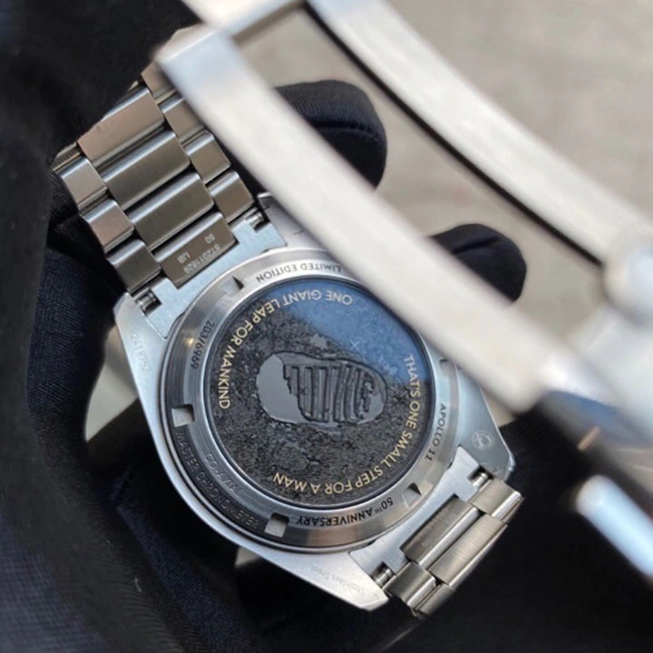 The watch includes a 42 mm case in stainless steel with a polished 18K Moonshine? Gold bezel. The bezel ring is polished black ceramic [ZrO2] with an OMEGA Ceragold? tachymeter scale. There is a varnished grey and black dial with all indexes and hands in 18K Moonshine? Gold – except the central chronograph seconds hand, which is PVD-coated in Moonshine Gold. A unique hour marker is positioned at 11 o’clock, and there is a distinctive 9 o’clock subdial in 18K Moonshine? Gold with a laser-engraved image of Buzz Aldrin climbing down onto the lunar surface.
