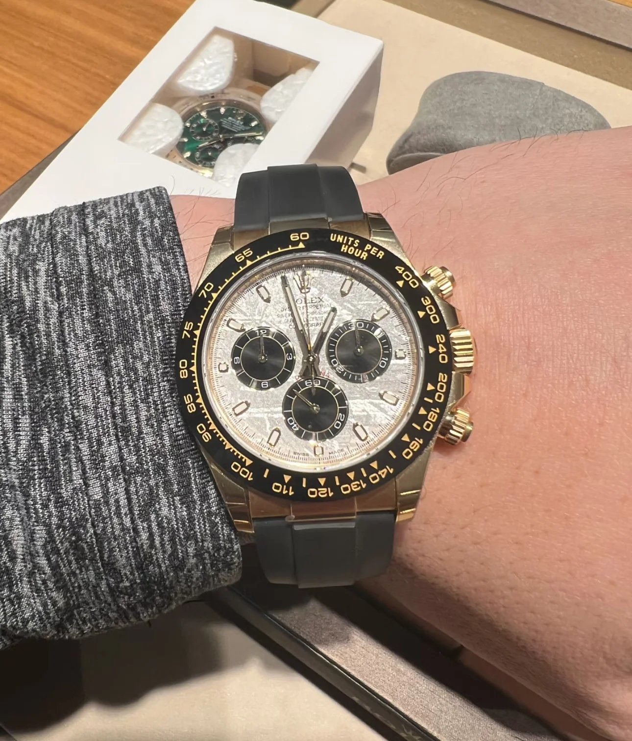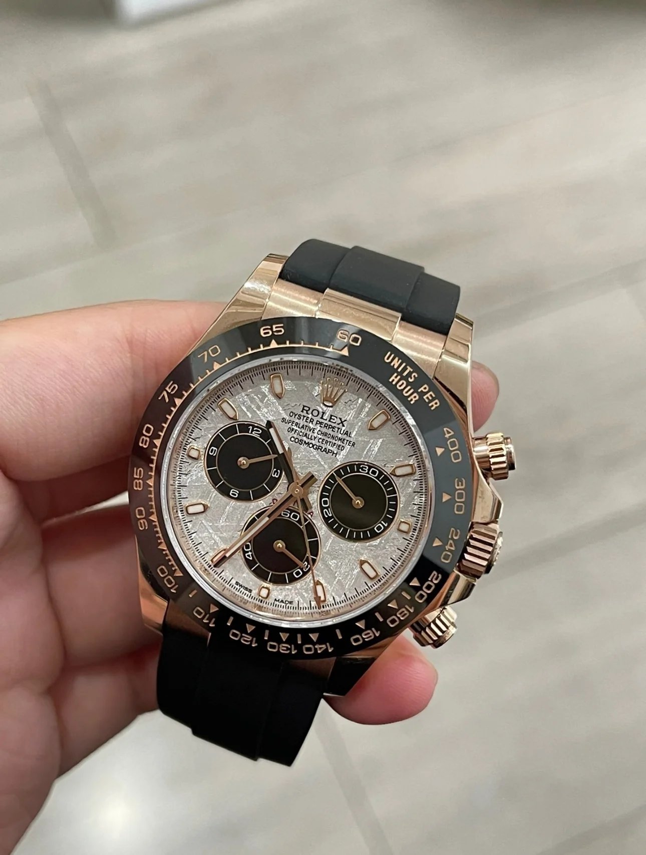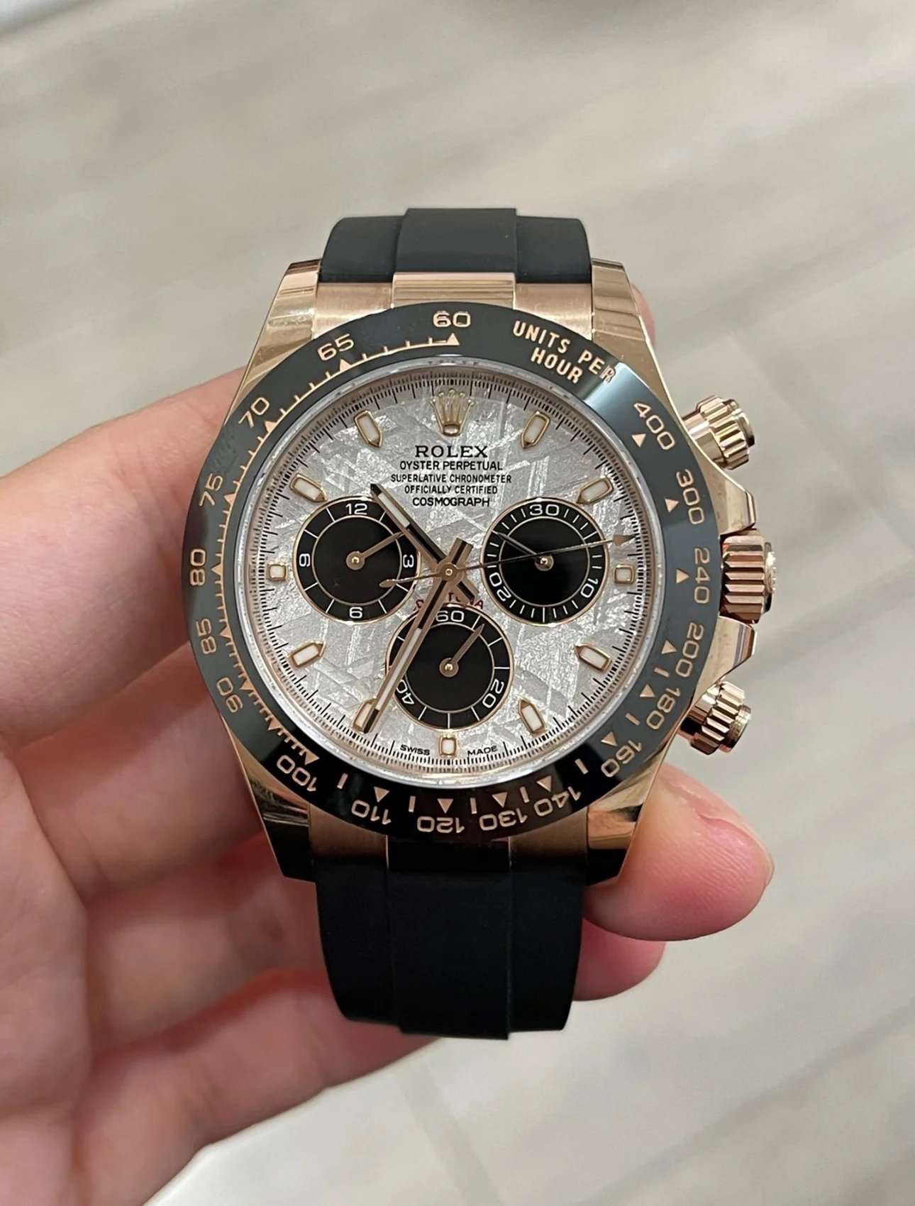 This is the only Cosmograph Daytona model equipped with a meteorite dial. Meteorites are the cores of exploded asteroids or planets that traverse the solar system before entering Earth’s orbit and falling to the planet due to gravitational pull.