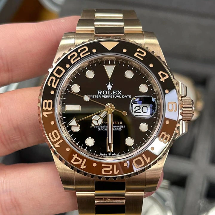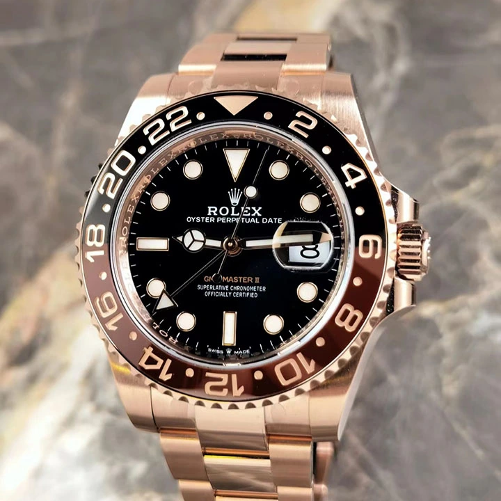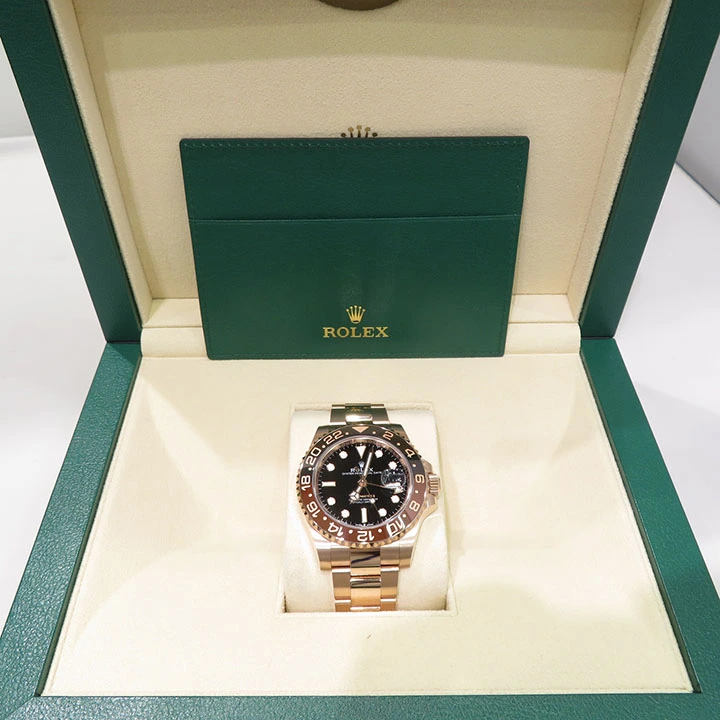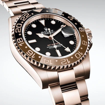 This model features a black dial and a two-colour Cerachrom bezel insert in brown and black ceramic. Designed to show the time in two different time zones simultaneously during intercontinental flights, the GMT-Master II has come to be recognized for its robustness and versatile appearance.
