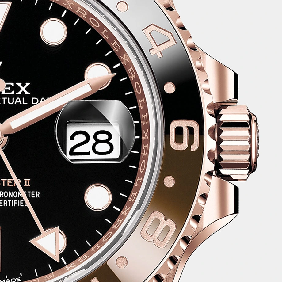 - Bidirectional rotatable 24-hour graduated bezel. Two-colour brown and black Cerachrom insert in ceramic, moulded numerals and graduations