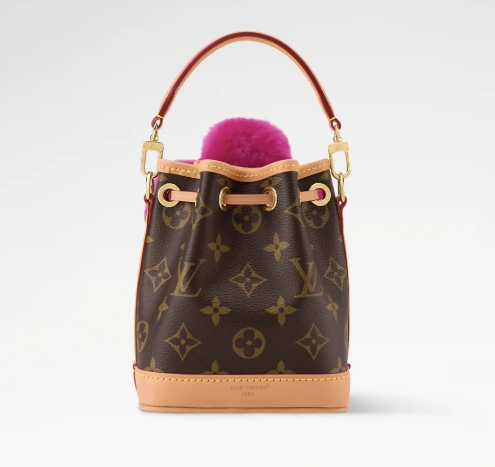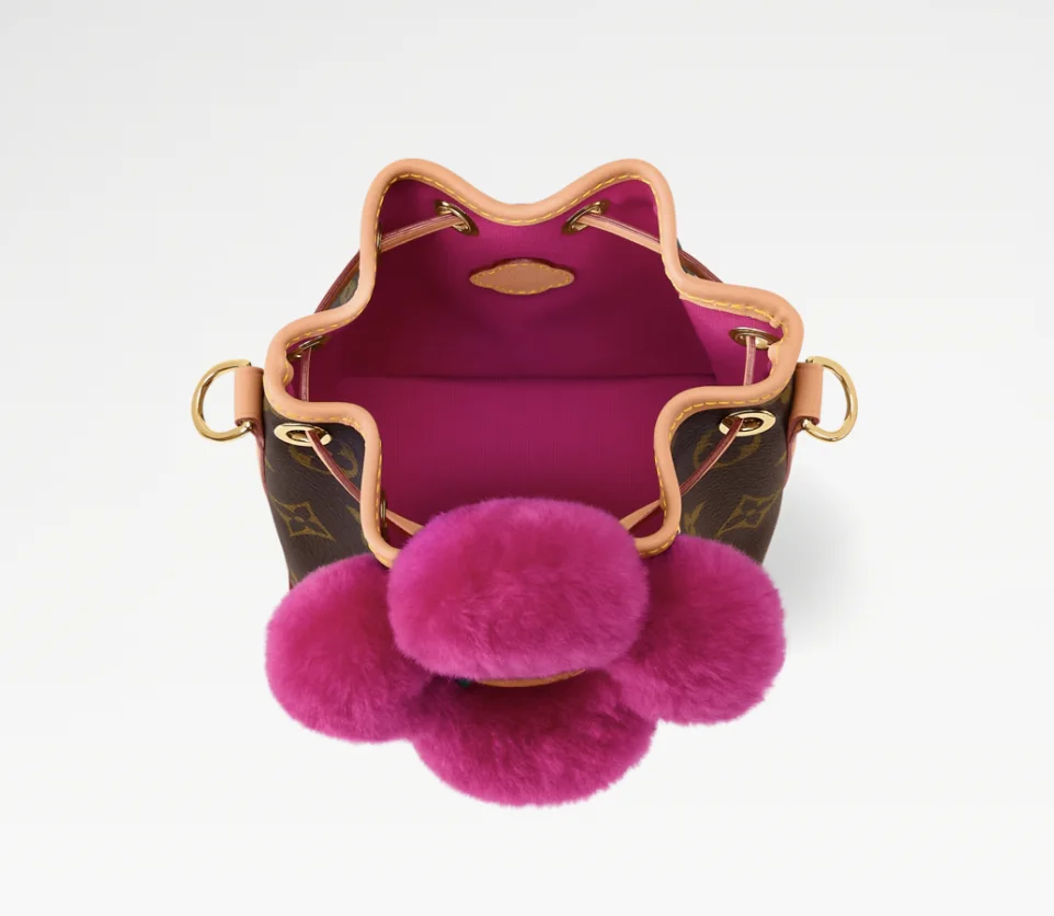 The Vivienne Winter Holiday collection lives up to its title with this Noé-Where design. It is crafted from signature Monogram canvas, trimmed with smooth cowhide and features a vibrant Frozen Orchid detail in shearling that represents the House’s mascot, Vivienne. The compact style fits everyday essentials and can be worn with or without the strap.
