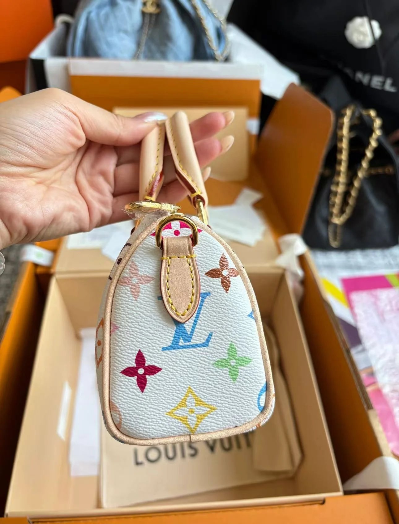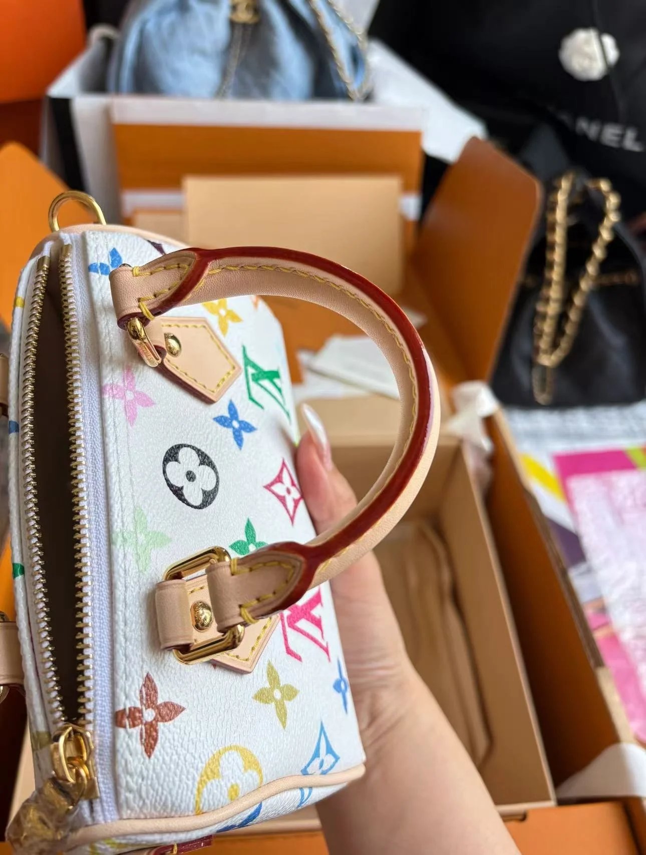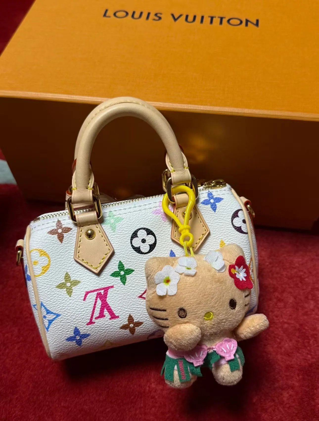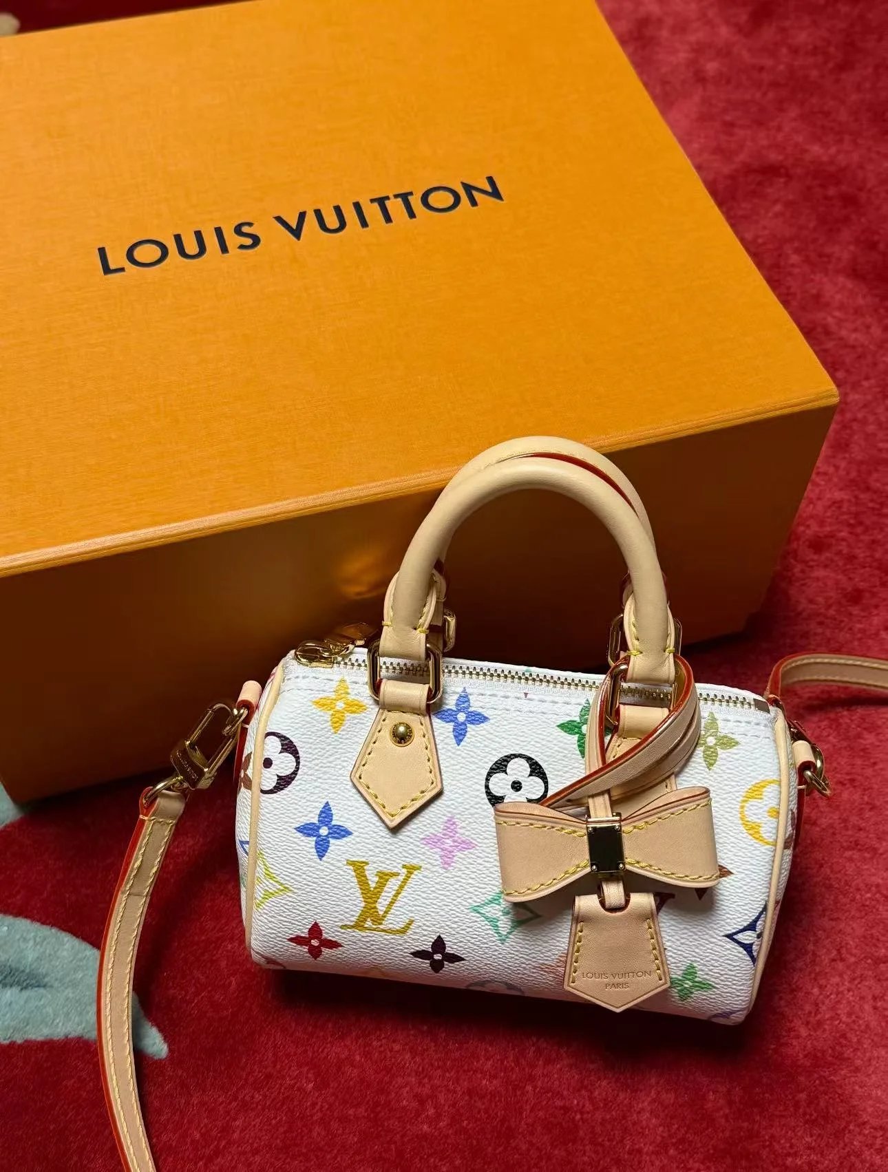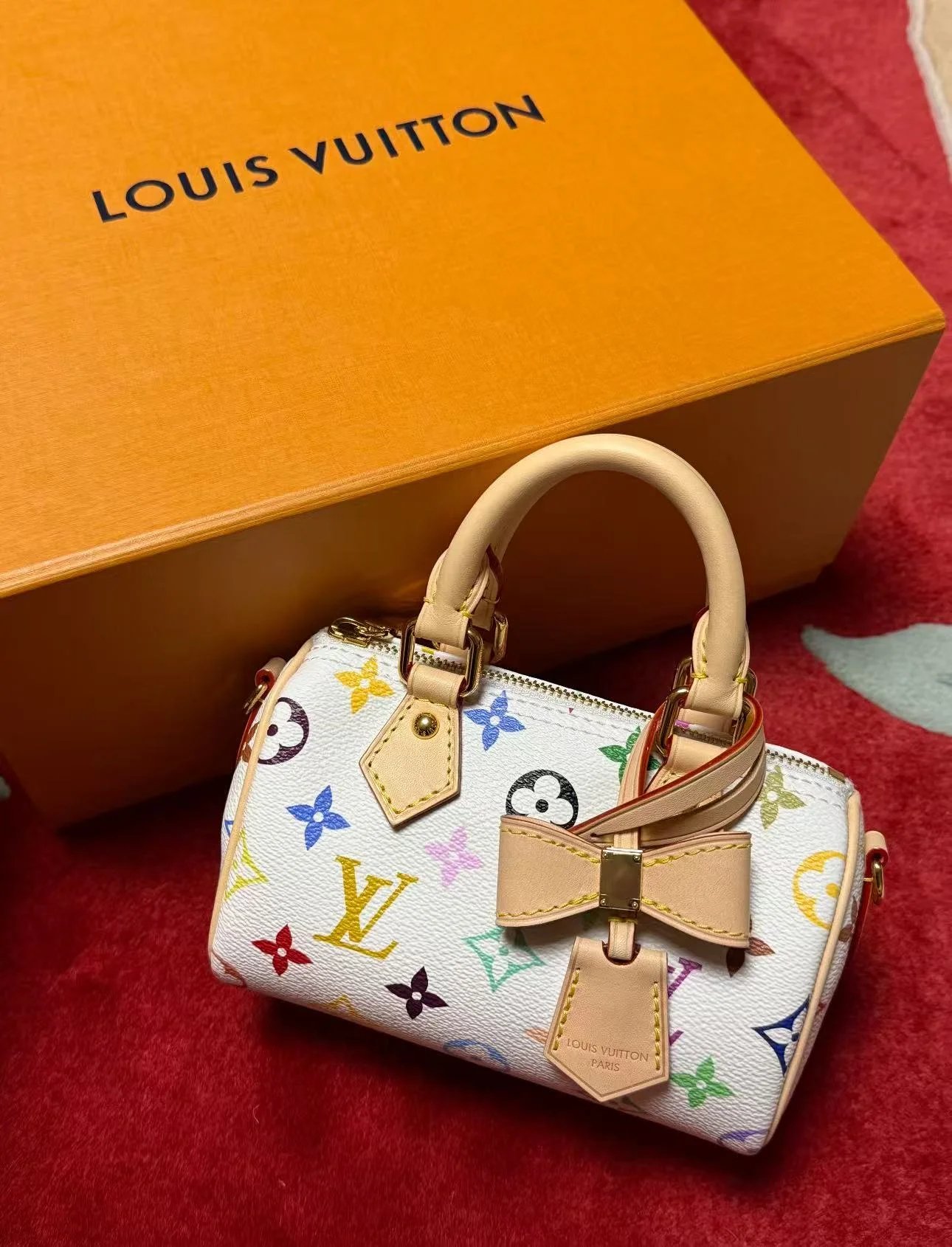 The scaled-down Nano Speedy(M13391) makes a playful statement in Monogram coated canvas, which has been reworked in upbeat tones as part of the re-edition of the Louis Vuitton x Murakami collection. Natural cowhide leather trims add a timeless touch, as do two Toron top handles and a gleaming golden padlock in homage to the House’s travel heritage. Complete with a removable, adjustable strap and an exclusive LV x TM keybell.