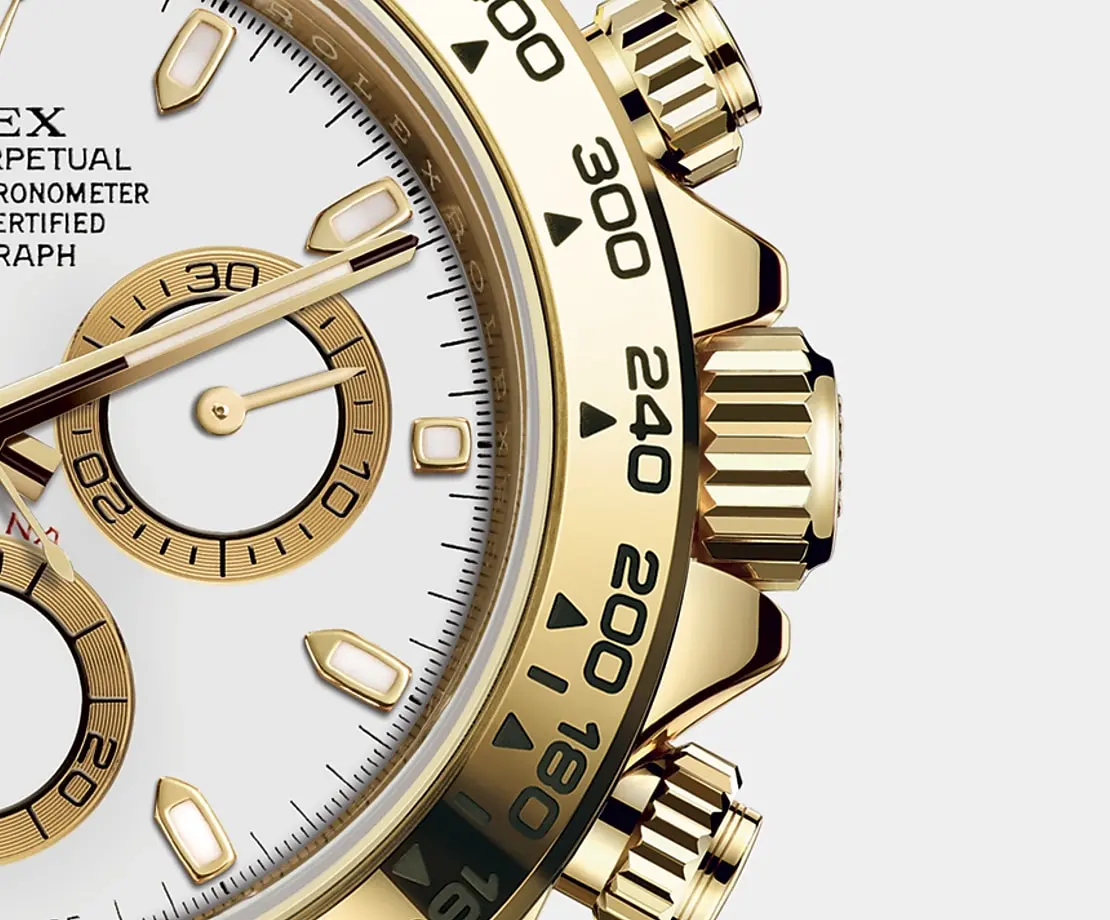 THIS OYSTER PERPETUAL COSMOGRAPH DAYTONA IN 18 KT YELLOW GOLD, WITH A WHITE DIAL AND AN OYSTER BRACELET, FEATURES 18 KT YELLOW GOLD BEZEL WITH ENGRAVED TACHYMETRIC SCALE.