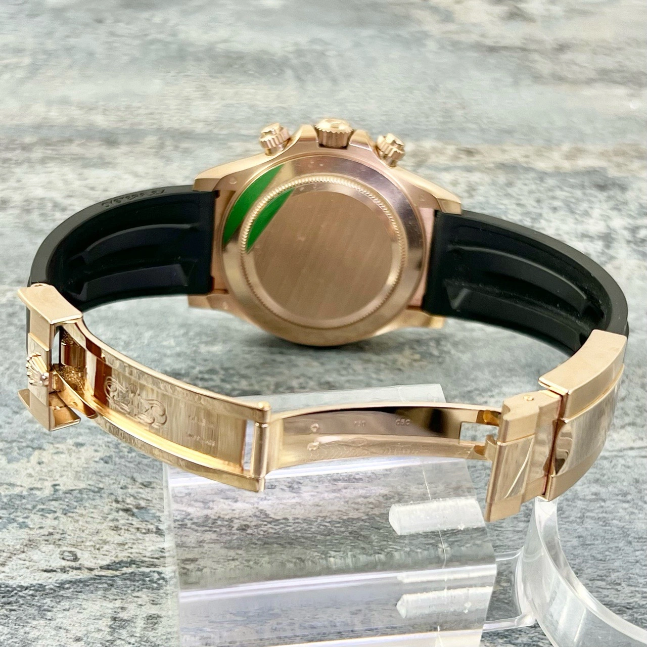 THIS OYSTER PERPETUAL COSMOGRAPH DAYTONA IN 18 KT EVEROSE GOLD WITH A BLACK, DIAMOND-SET DIAL AND AN OYSTERFLEX BRACELET, FEATURES A BLACK CERACHROM BEZEL WITH TACHYMETRIC SCALE.