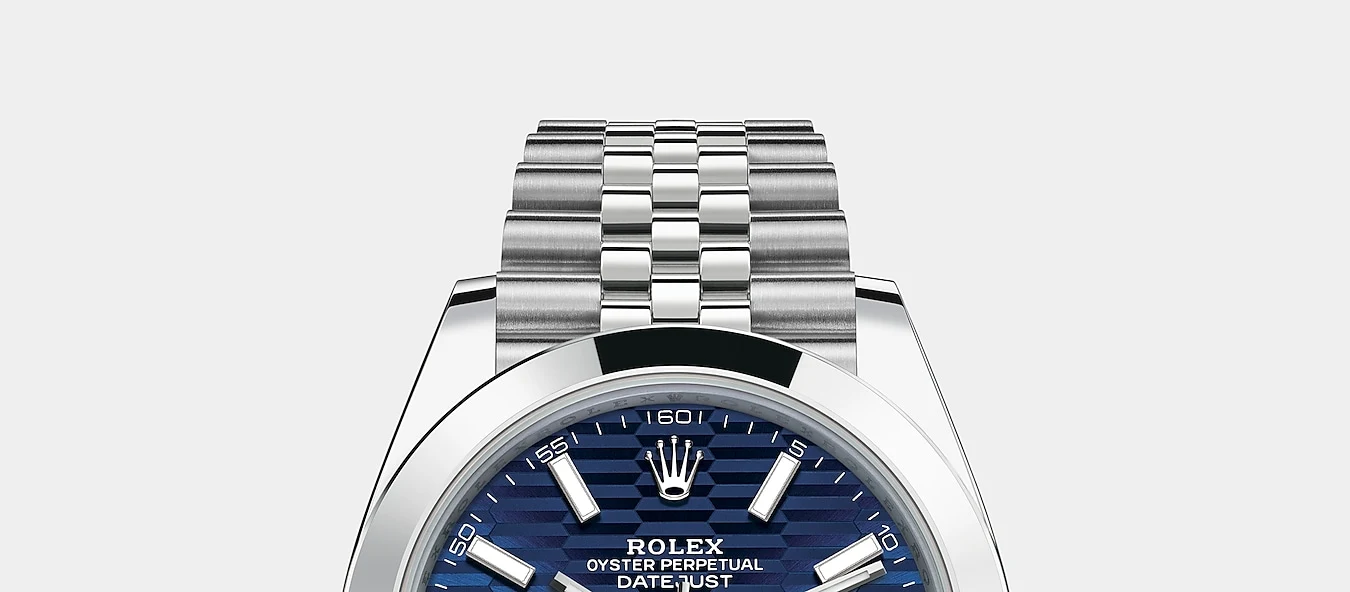 THIS OYSTER PERPETUAL DATEJUST 41 IN OYSTERSTEEL FEATURES A BRIGHT BLUE, FLUTED-MOTIF DIAL AND A JUBILEE BRACELET.