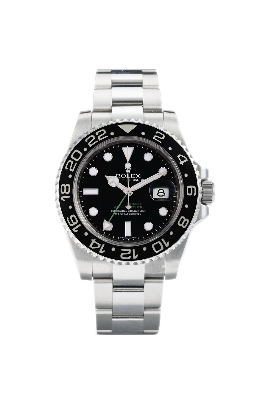 With traditional hour, minute and seconds hands, a triangle-tipped 24-hour hand, and a bidirectional rotatable bezel with 24-hour graduated Cerachrom insert, the GMT-Master II can display the time in two time zones simultaneously: either the local time and the reference time, or the local time and that of an alternative time zone. The date, at 3 o??clock on the dial, is synchronized with the local time.