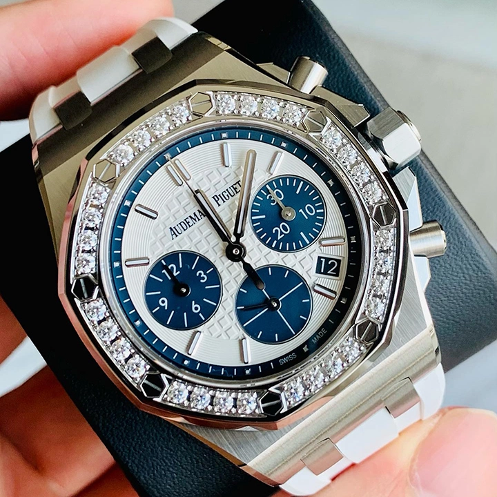 white gold luminescent applied hour-markers and Royal Oak hands.