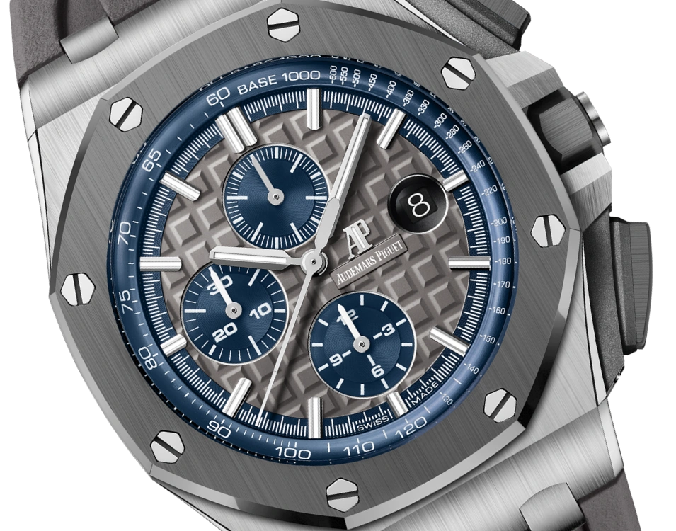 Grey dial with ??Mega Tapisserie?? pattern, blue counters and blue external zone, white gold applied hour-markers and Royal Oak hands with luminescent coating, blue inner bezel.