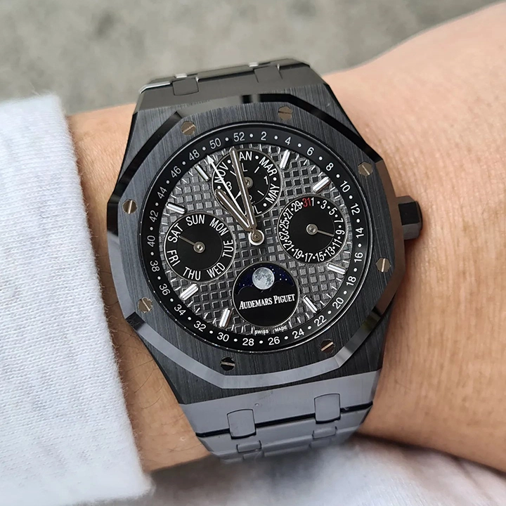 Crafted in hand-finished black ceramic, this Royal Oak Perpetual Calendar features day, date, month, astronomical moon, and week of the year. The leap year indication ?? pioneered by Audemars Piguet in 1955 ?? is also featured on the ??Grande Tapisserie?? decorated dial.