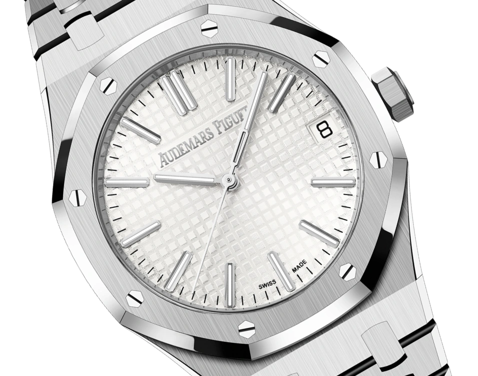 This stainless steel Royal Oak Selfwinding in 41 mm, adorned with a silver-toned Grande Tapisserie dial, presents the collection??s new ergonomic design evolution.