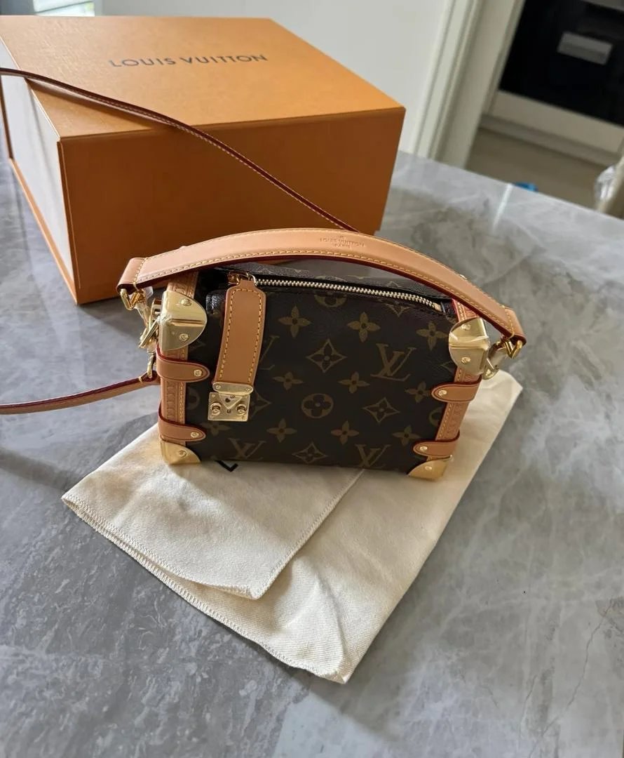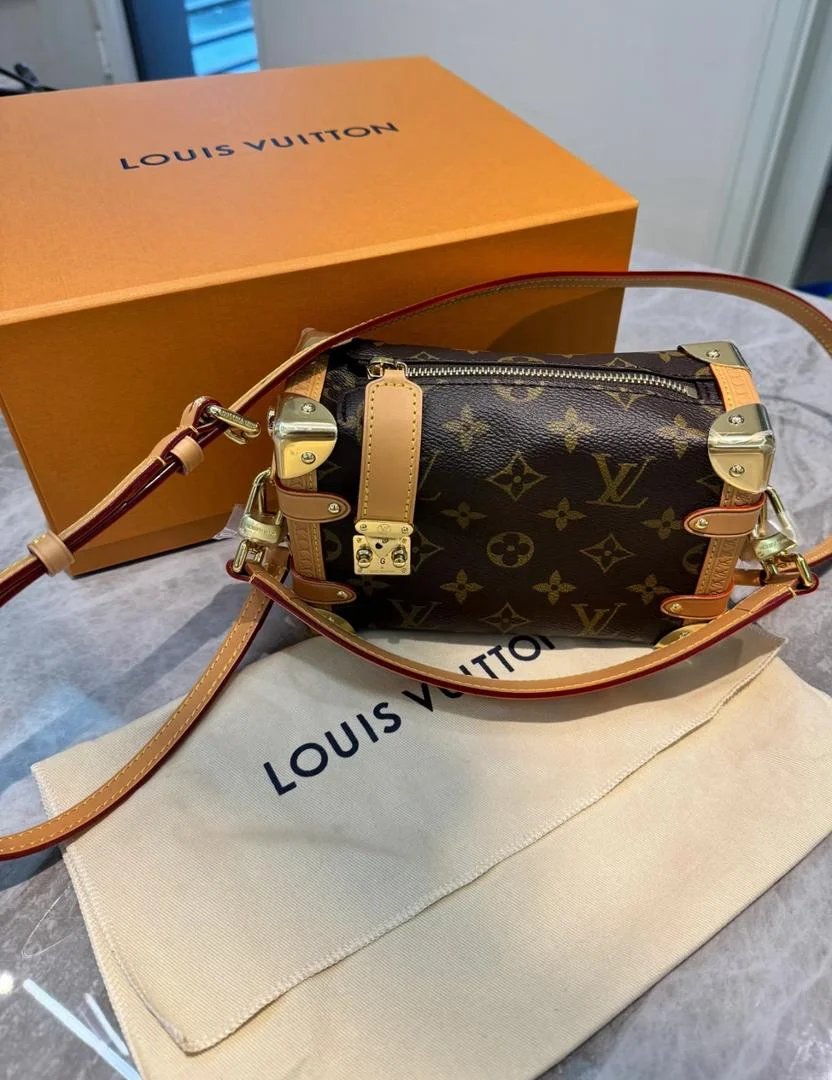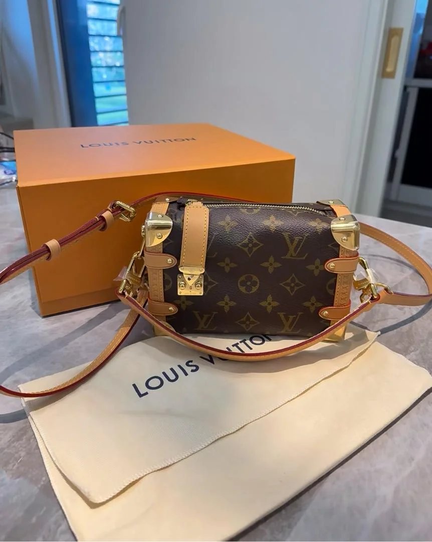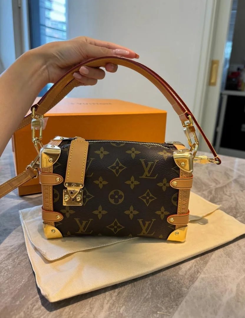 Evocative of the House’s historic trunks, the Side Trunk PM’s rectangular shape is fashioned from Monogram canvas with cowhide-leather trim and gold-color hardware. The reinforced corners and S-lock attached to the zipper are directly inspired by Louis Vuitton trunks. It can be carried by hand or on the shoulder thanks to the removable and adjustable leather strap.