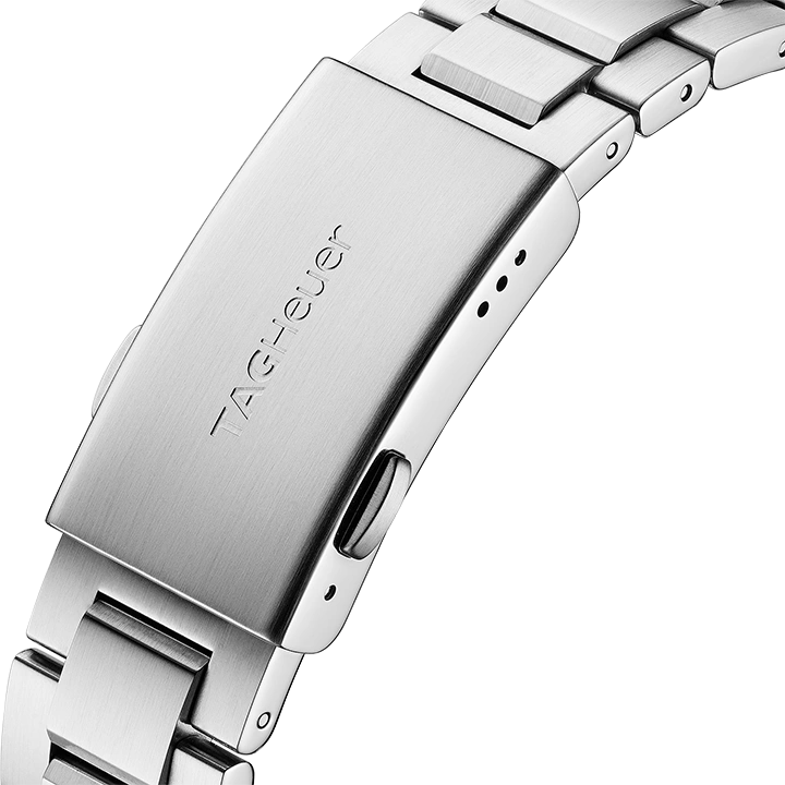 In three-row fine-brushed steel, with folding clasp and safety push buttons to prevent accidental opening, and an integrated diver extension that allows it to be worn over a wet suit for diving or surfing.