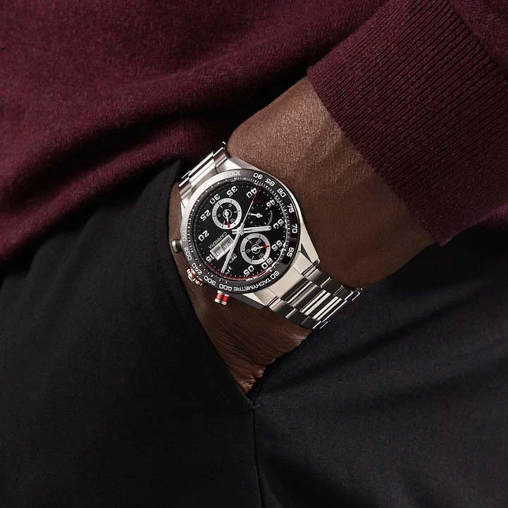 The black dial of this TAG Heuer Carrera asserts itself with sporty red touches as well as numerals and text in an emblematic new font.