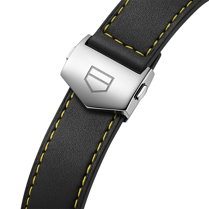 The black calfskin strap has a black lining lined with Senna yellow stitching and an exclusive embossed “S” pattern. The steel folding clasp has a double safety system and a pilot extension for wearing over a driving suit.